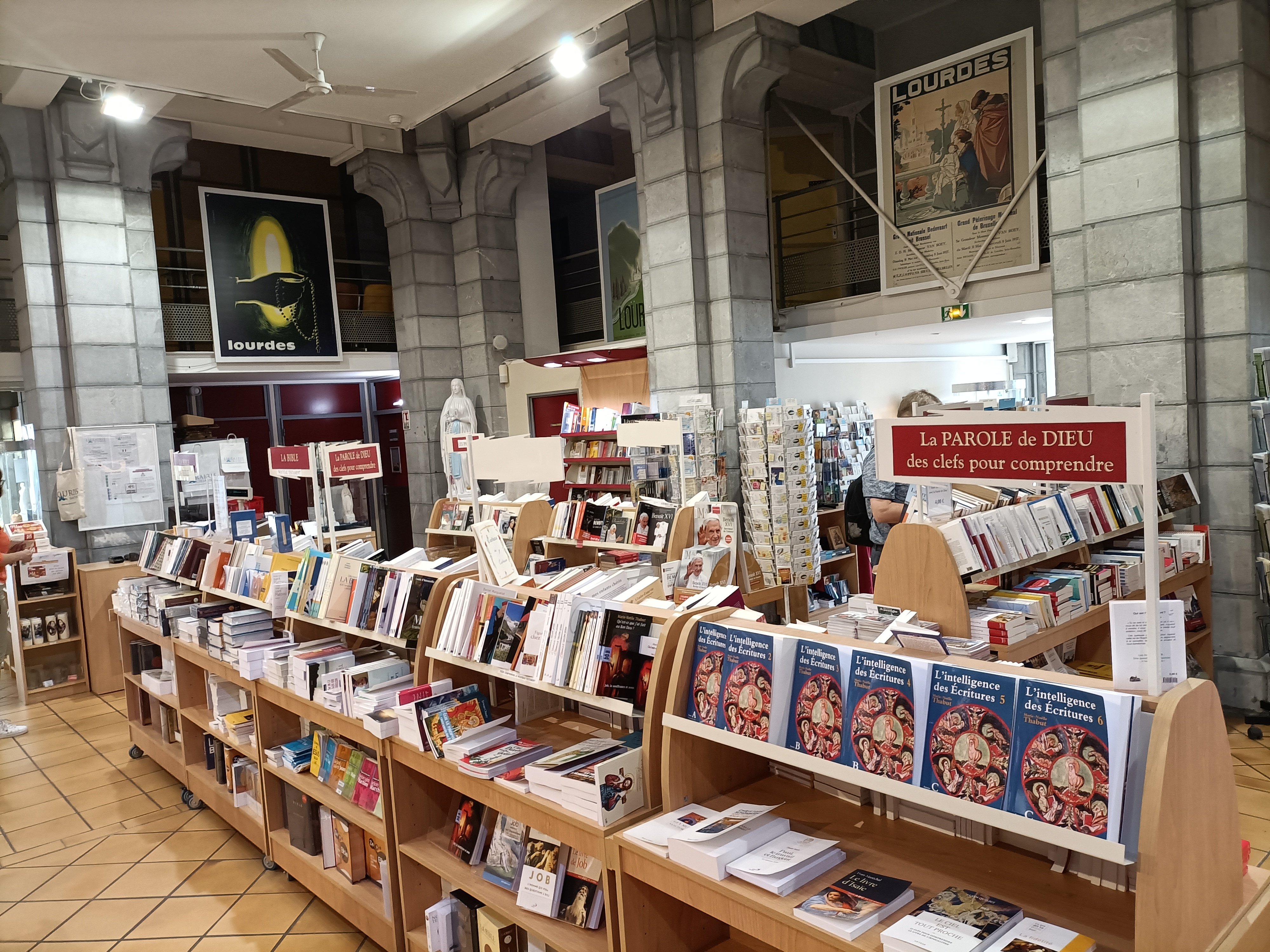 Posté le 06/09/2023 à 06:05" Une librairie religieuse située à l'intérieur de la grotte de Lourdes en France. Ici, vous pouvez tout acheter, du livre au souvenir. Des choses dans différentes langues. "